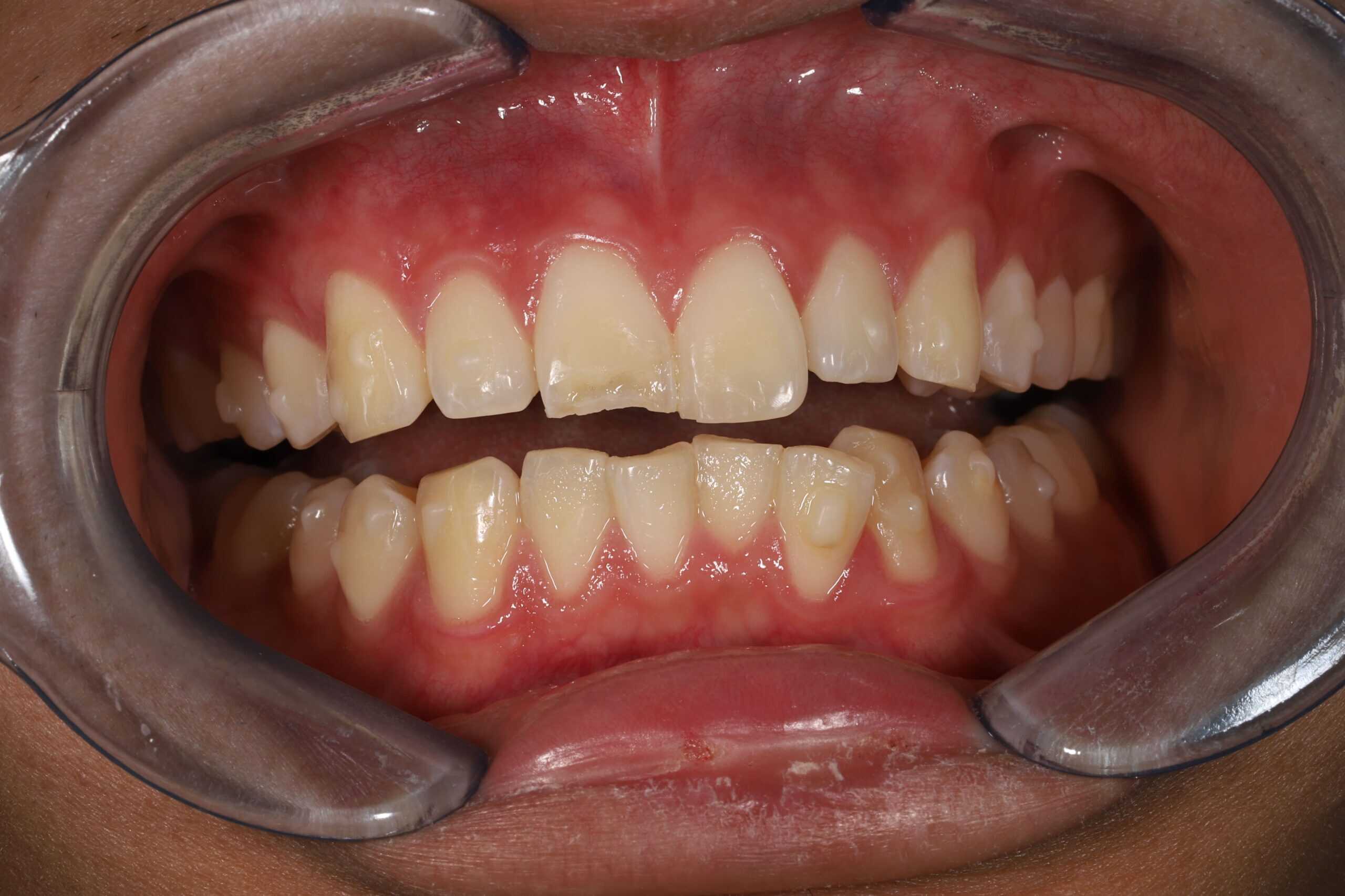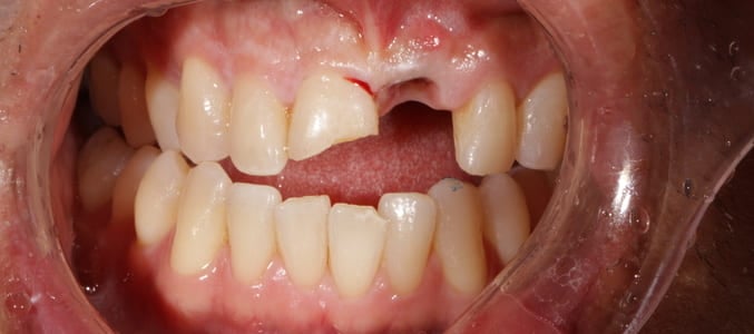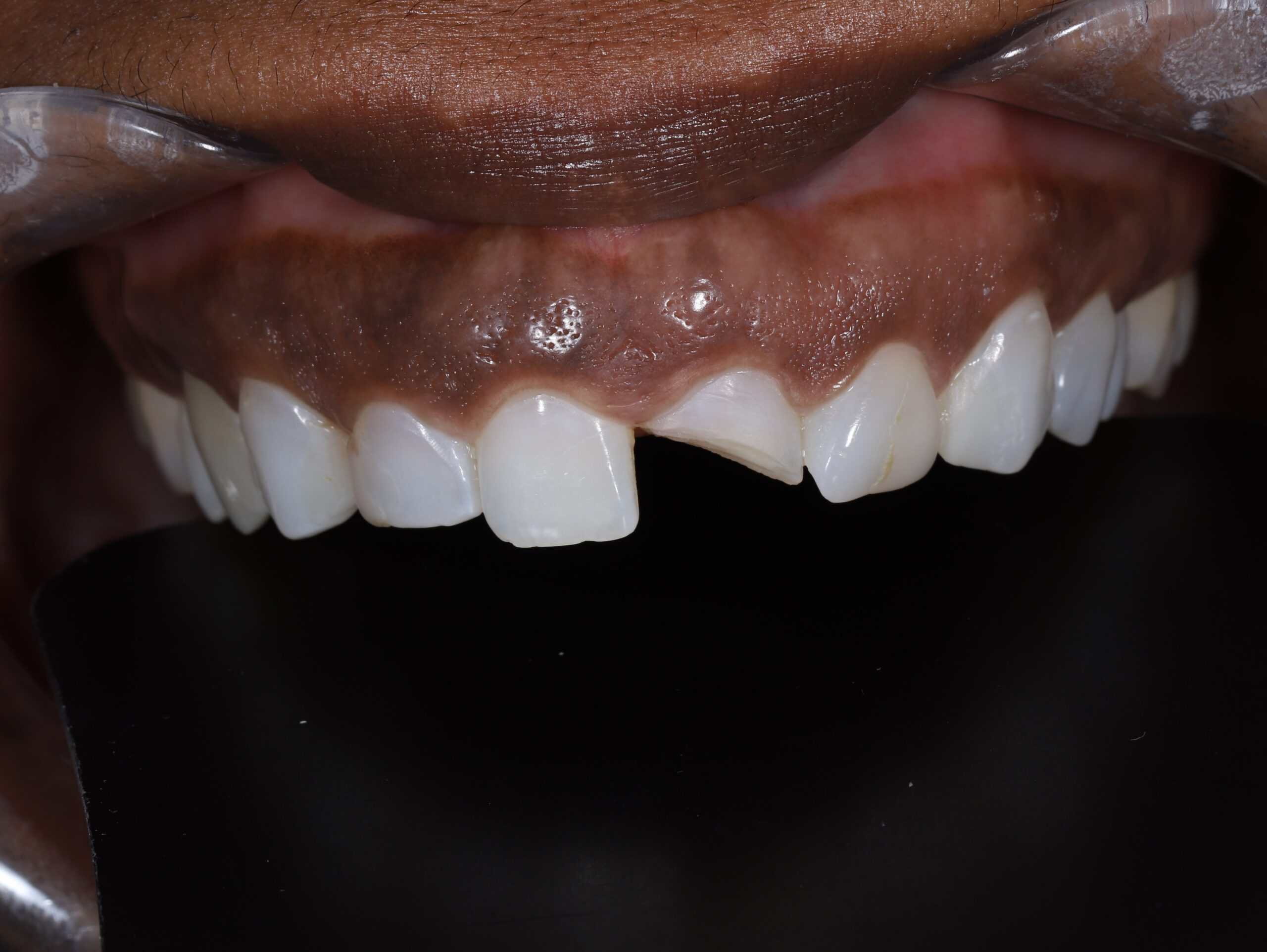 This fractured tooth was restored with a porcelain veneer. Matching the two upper front teeth is extremely difficult.
