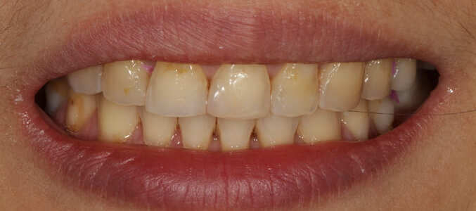 Acid erosion and malocclusion (a “bad bite”) impacted this patient’s health and smile. It resulted in the breakdown and destruction of her teeth, as well as the collapse of her bite. In just a few visits, this patient was able to restore the health and beauty of her mouth.